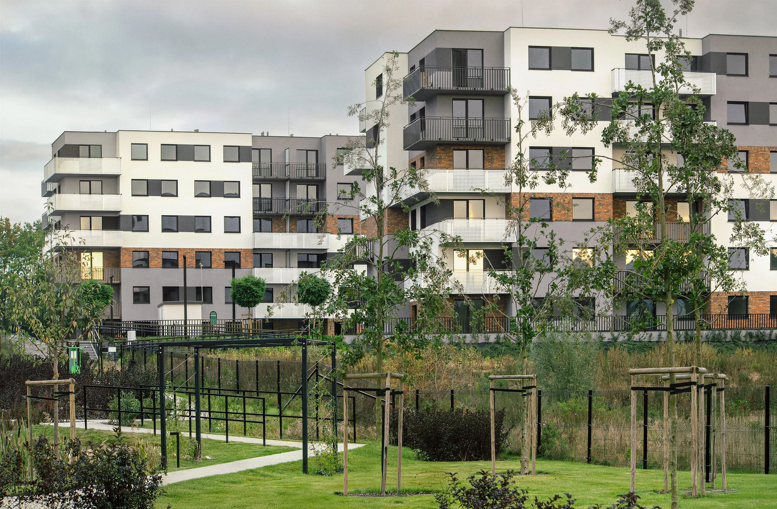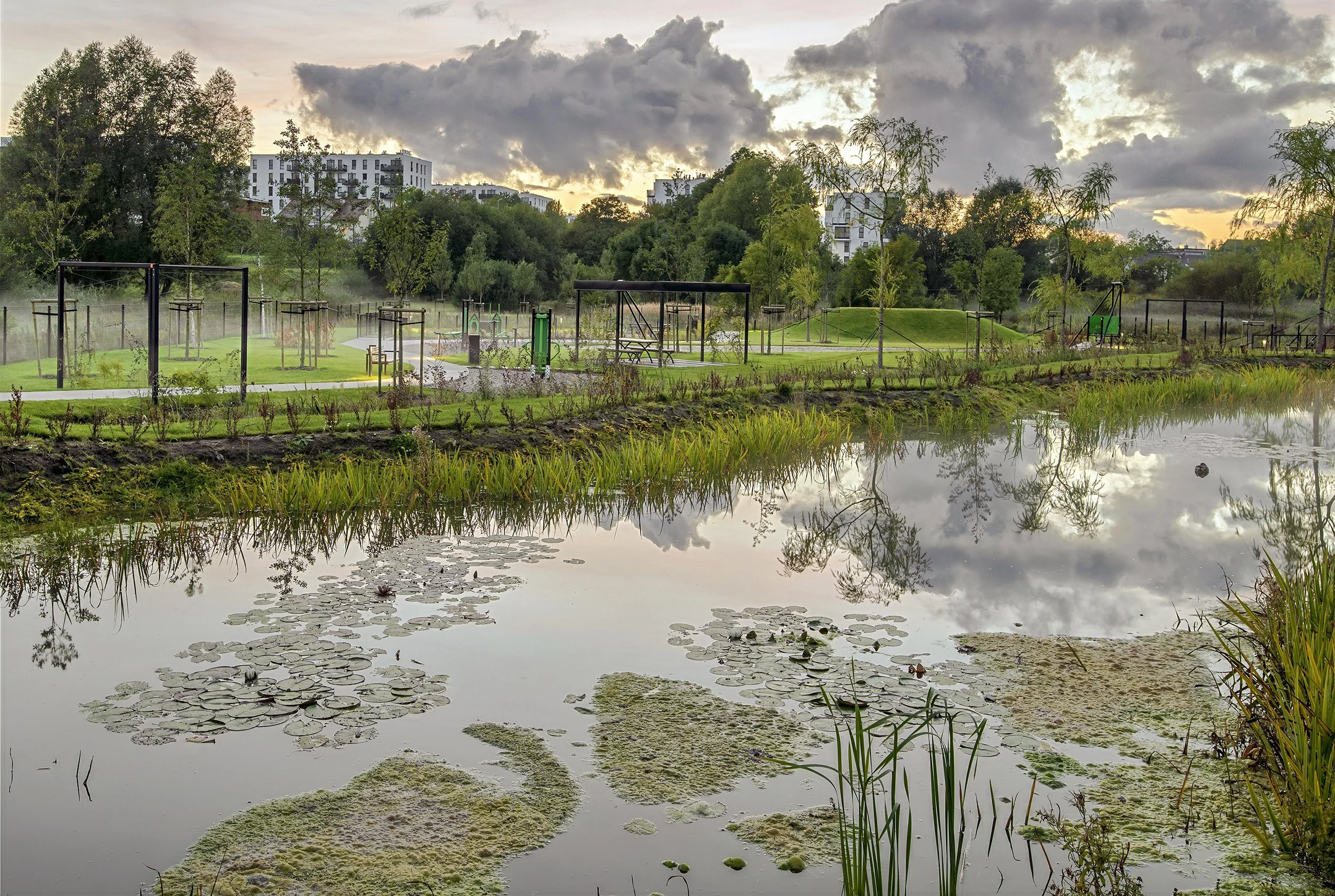 Park zaprojektowany w ramach inwestycji stanowi centralny punkt życia społecznego osiedla. Znajdują się tu różnorodne przestrzenie rekreacyjne — plac zabaw wyposażony m.in. w tyrolkę, wiata piknikowa idealna na sąsiedzkie spotkania oraz staw retencyjny, który oprócz funkcji krajobrazowej wspiera naturalne gospodarowanie wodami opadowymi. Dzięki tym rozwiązaniom osiedle sprzyja zarówno odpoczynkowi, jak i aktywności na świeżym powietrzu, oferując mieszkańcom codzienny kontakt z naturą.
